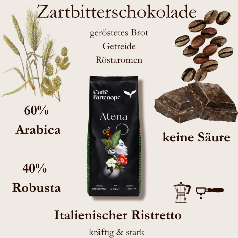 Die Atena ist eine hervorragende, harmonische und doch kräftig geröstete Mischung direkt aus Neapel – ganz nach Süditalienischer Tradition.